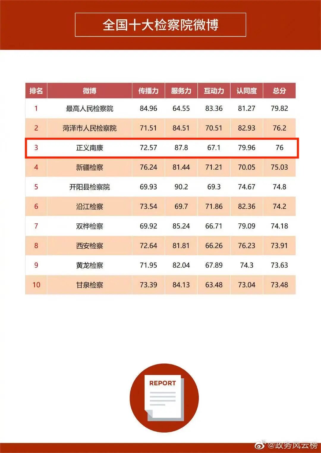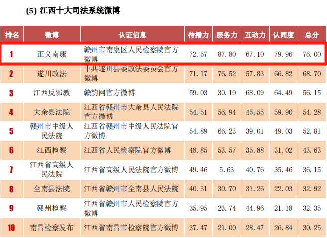 2023年1月6日,《2022年度政务微博影响力报告》正式发布。其中,在由微博出品、人民网舆情数据中心提供学术支持的“2022 年度政务微博影响力排行榜”中,赣州市南康区人民检察院官方微博号“正义南康”上榜“全国十大检察院微博”榜单,位列第3名。“正义南康”微博同时上榜“江西十大司法系统微博”榜单,位列第1名。