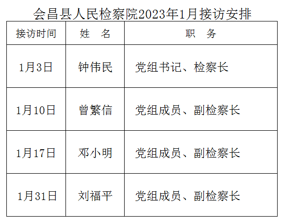 为贯彻落实中共中央、国务院印发的《信访工作条例》,推动解决群众反映的实际问题,提升人民群众对检察工作的满意度,根据会昌县人民检察院的接访工作安排,现将2023年1月“检察长接访日”安排公告如下: