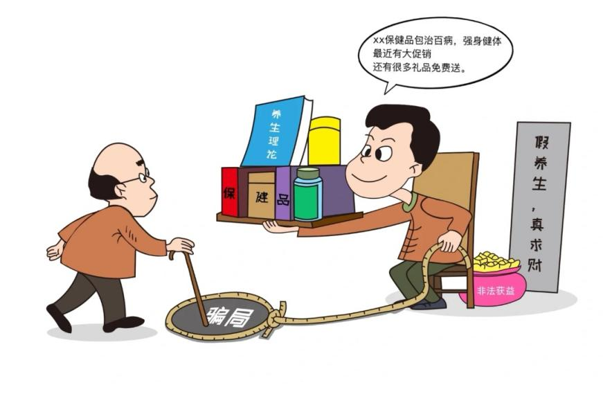 这类诈骗手段主要表现为通过提供免费旅游观光、情感陪护、虚假宣传等手段,采取商品回购、寄存代售、消费返利、会议营销、养生讲座等方式,哄骗老人购买价格虚高的保健品或者假冒伪劣产品。