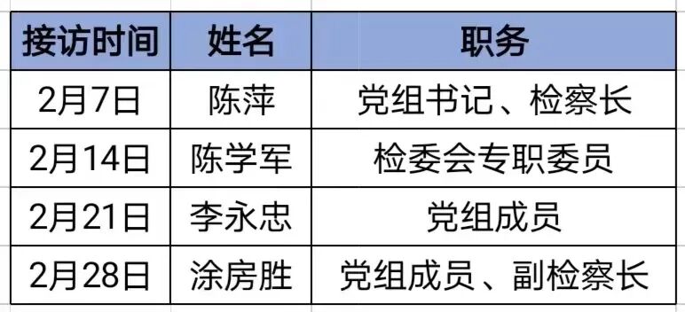 为深入贯彻习近平法治思想,展现新时代检察机关践行以人民为中心的司法理念,提高12309检察服务中心的知晓度和人民满意度,推动矛盾纠纷化解,促进案结事了人和,现将全南县人民检察院2023年2月接访安排公告如下: