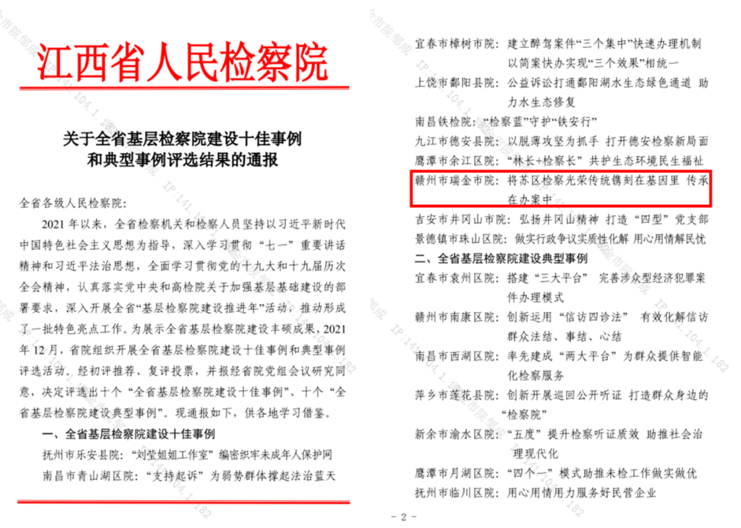 近年来,瑞金市检察院坚持以习近平新时代中国特色社会主义思想和习近平法治思想为指导,继承和弘扬苏区检察光荣传统,坚持党建引领,坚持以人民为中心,坚持新时代党的群众路线,立足青年干警占七成以上的工作实际,组建瑞检“青”骑兵,活跃在检察监督、矛盾化解、普法释法、乡村振兴、志愿服务的第一线,成为政治与业务深度融合的见证,成为瑞金维护社会稳定、优化营商环境、推进市域社会治理的重要法治力量,事迹相继被中央电视台、光明日报、法治日报、检察日报、学习强国、江西日报、赣南日报等主流媒体报道。今年9月获评“第二届全国检察机关十佳文化品牌”,全省唯一。