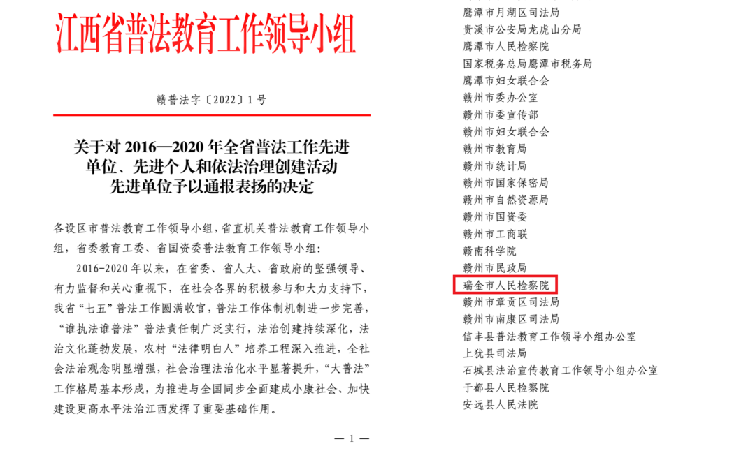多年来,瑞金市检察院通过认罪认罚从宽、公开听证、巡回法庭,将释法说理贯穿检察办案全过程。推动检力下沉,组织“检察村村通”“普法大篷车”“与代表同行”等活动,进机关、进企业、进乡镇、进学校、进社区、进农村,常态化活跃在田间屋场、宗族祠堂、百姓人家,瑞金大街小巷、边远乡村、各个角落都留下了“瑞检青骑兵”的普法足迹。同时积极构建新媒体矩阵,推出“检察官说法”“瑞金身边案”“检话简说”等栏目,用身边实实在在的案例,用通俗易懂的语言,讲述法律故事,诠释法律道理,引导法治思维,传播法治精神。年初作为瑞金唯一一家单位获评“2016-2020年全省普法工作先进单位”。