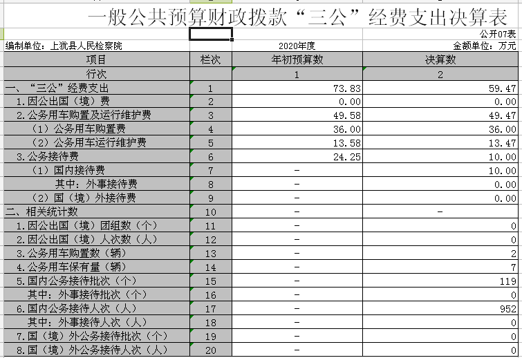 本部门2020年度一般公共预算财政拨款“三公”经费支出年初预算数为 73.83 万元,决算数为 59.47 万元,完成预算的 80.55 %,决算数较2019年增加 12.38 万元,增长26.29 %,其中: