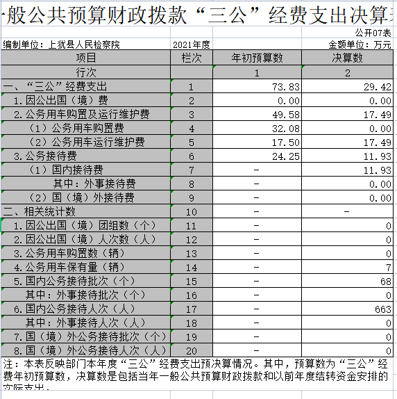 七、“三公”经费包括因公出国(境)费用、公务接待费和公务用车购置及运行维护费。其中:因公出国(境)费用反映单位公务出国(境)的国际旅费、国外城市间交通费、住宿费、伙食费、培训费、公杂费等支出;公务接待费反映单位按规定开支的各类公务接待(含外宾接待)费用;公务用车购置及运行维护费包括公务用车购置费用和公务用车运行维护费用,前者反映单位按照规定公务用车购置支出(含车辆购置税),后者反映单位按照规定保留的公务用车燃料费、维修费、过路过桥费、保险费、安全奖励费用等支出。